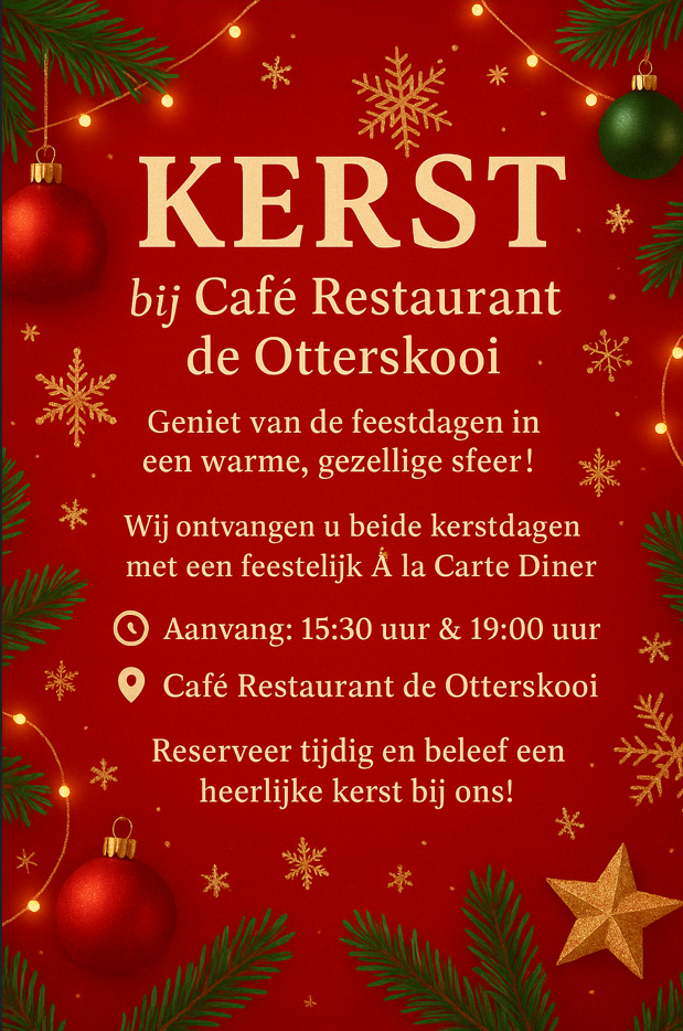 Natuurlijk zijn de Otterskooise Snoekbaars en Paling favoriet bij een groot aantal gasten, maar de Wiener Schnitzel, Tournedos of Varkenshaas worden met evenveel liefde bereid. Net zoals, desgewenst, een vegetarische maaltijd. En natuurlijk zijn er Seizoenspecialiteiten als Wild, Mosselgerechten, etc. Ook de Kleine Kaart biedt ruime keuze en de Buffetten voor groepen vanaf 25 personen dragen mooie namen als Dwarsgracht -buffet of Otterskooi-buffet.